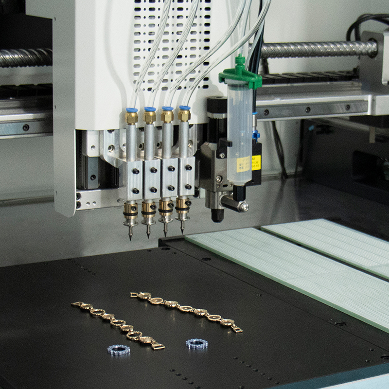 产品特点:单头点胶多头切换柔性点钻,多种不同规格大小的钻石同时加工,视觉自动识别,